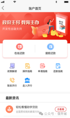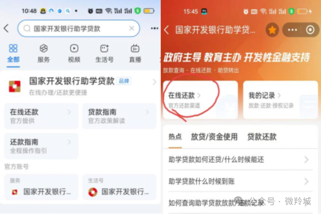 打开云闪付APP,搜索“国家开发银行助学贷款”,进入小程序。点击【在线还款】,进入助学贷款信息查询流程。
