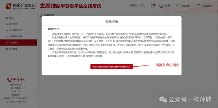 (1)进入系统后点击菜单列“本金延期”,弹框政策提示弹框,提示框下方设置按钮“我已完整阅读并充分理解上述政策和相关释义”)。