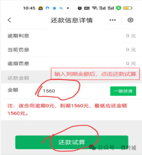 核查当期需还本金金额,点“金额”处,足额输入该合同当期应还本金金额后,点击【还款试算】。注意:默认是结清该合同总金额(一键结清)。