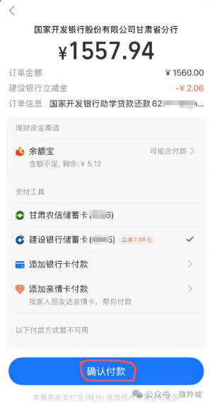 方式二:支付宝还款。手机登录支付宝,搜索“国家开发银行助学贷款”,进入“国家开发银行助学贷款”小程序后,点击“在线还款”,输入借款学生姓名和身份证号即可查询或还款。
