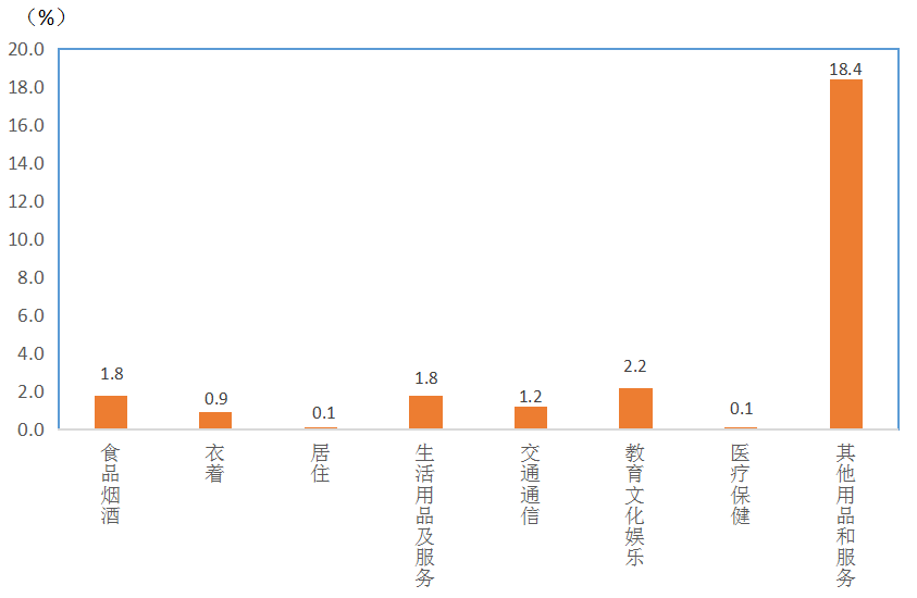 一、各类商品及服务价格同比变动情况 3月份,食品烟酒及在外餐饮类价格同比上涨1.8%,影响CPI(居民消费价格指数)上涨约0.68个百分点。食品中,畜肉类价格上涨5.0%,影响CPI上涨约0.40个百分点,其中牛肉价格上涨8.6%,影响CPI上涨约0.21个百分点,羊肉价格上涨8.0%,影响CPI上涨约0.23个百分点,猪肉价格下降5.6%,影响CPI下降约0.08个百分点;鲜菜价格上涨5.0%,影响CPI上涨约0.13个百分点;薯类价格上涨1.7%,影响CPI上涨约0.01个百分点;鲜果价格上涨5.2%,影响CPI上涨约0.11个百分点;鸡蛋价格下降2.2%,影响CPI下降约0.01个百分点;水产品价格下降3.4%,影响CPI下降约0.01个百分点。 其他七大类商品服务价格同比全部上涨。其中,其他用品及服务价格上涨18.4%,教育文化娱乐价格上涨2.2%,生活用品及服务价格上涨1.8%,交通通信价格上涨1.2%,衣着价格上涨0.9%,居住价格上涨0.1%,医疗保健价格上涨0.1%。 3月份居民消费价格分类别同比涨跌幅