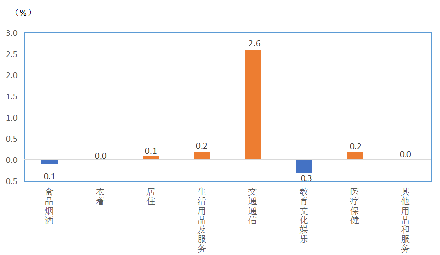 二、各类商品及服务价格环比变动情况 3月份,食品烟酒及在外餐饮类价格环比下降0.1%,影响CPI(居民消费价格指数)下降约0.37个百分点。食品中,鲜果价格下降3.5%,影响CPI下降约0.08个百分点;薯类价格下降1.6%,影响CPI下降约0.01个百分点;畜肉类价格下降0.3%,影响CPI下降约0.02个百分点,其中猪肉价格下降1.8%,影响CPI下降约0.02个百分点,牛肉、羊肉价格持平;水产品价格持平;鲜菜价格下降10.1%,影响CPI下降约0.30个百分点。 其他七大类商品和服务价格环比四涨二平一降。其中,交通通信价格上涨2.6%,生活用品及服务价格上涨0.2%,医疗保健价格上涨0.2%,居住价格上涨0.1%;教育文化娱乐价格下降0.3%,其他用品及服务价格、衣着价格持平。 3月份居民消费价格分类别环比涨跌幅