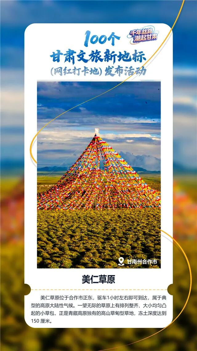 美仁大草原是通往莲花山和康多大峡谷的必经之路,随着2015年合冶二级公路的正式开通,也使得美仁草原成为这条旅游线路上的黄金中转站,成为“大景区里的小景区”,让人们可以慢下来欣赏美景。