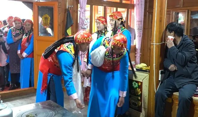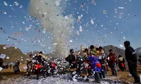 人们手拿柏香、烟酒、腊肉、年馍、青稞炒面等