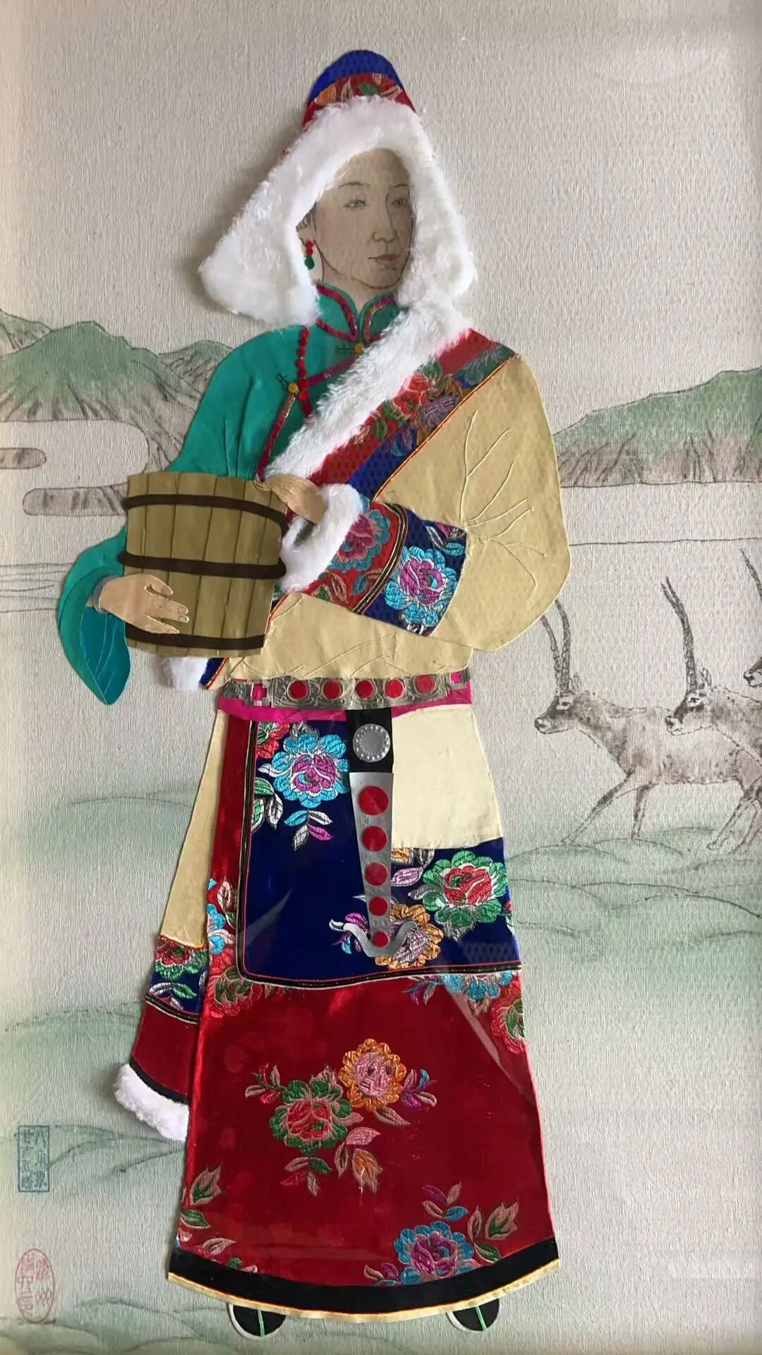 甘南堆绣选料考究,以真丝绸缎作为主要材料,各种颜色的纯棉绣线、牛羊绒为辅,配合数十种矿物颜料,用剪、堆、绣、染等传统手工艺,勾勒描线,绘制出惟妙惟肖的人物、花草、服饰。
