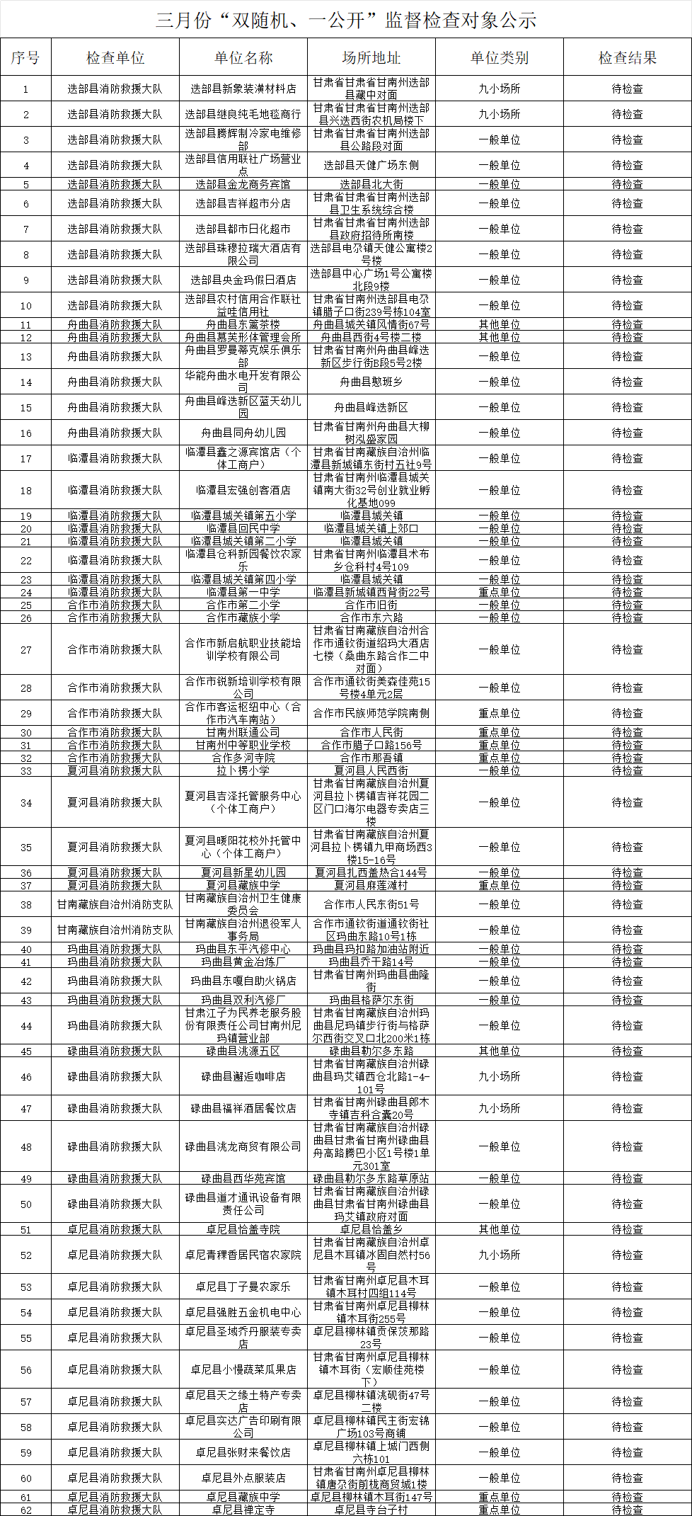 根据应急管理部消防救援局《关于全面推行“双随机、一公开”消防监管工作的通知》(应急消【2019】241号)及甘肃省消防救援总队《全面推行“双随机、一公开”消防监管工作方案》的统一部署,甘南州消防支队从2019年10月1日起全面推行“双随机、一公开”消防监管工作模式。根据相关要求,现将2026年三月份“双随机、一公开”监督检查对象公示如下: