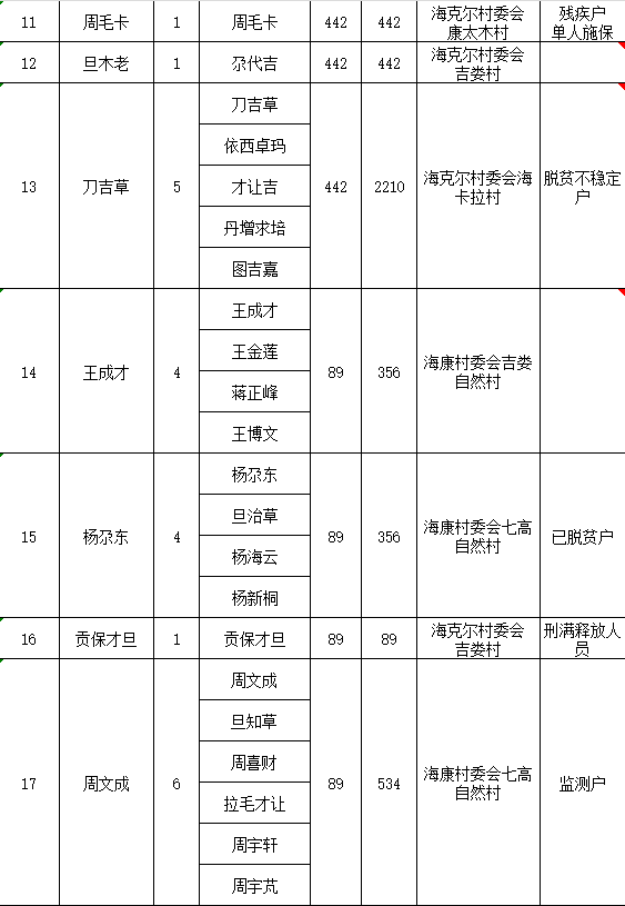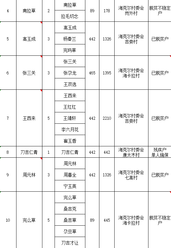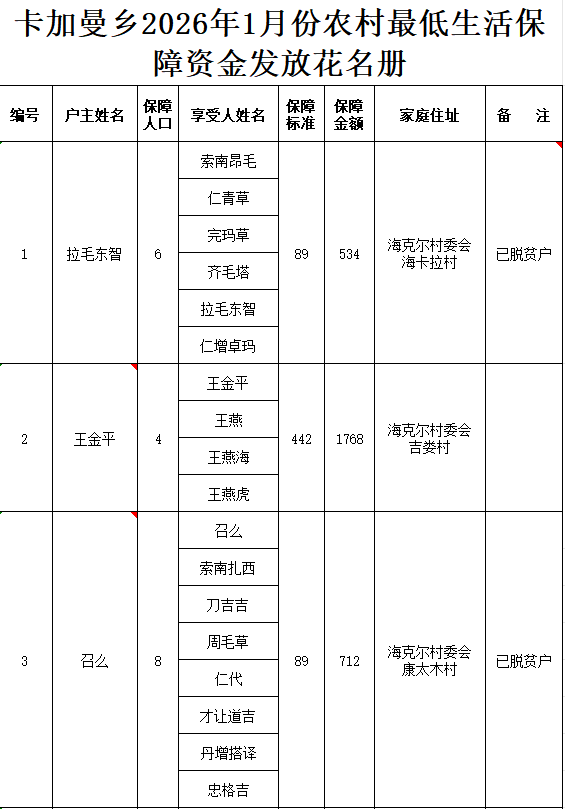海克尔村2026年1月份农村最低生活保障资金发放花名册