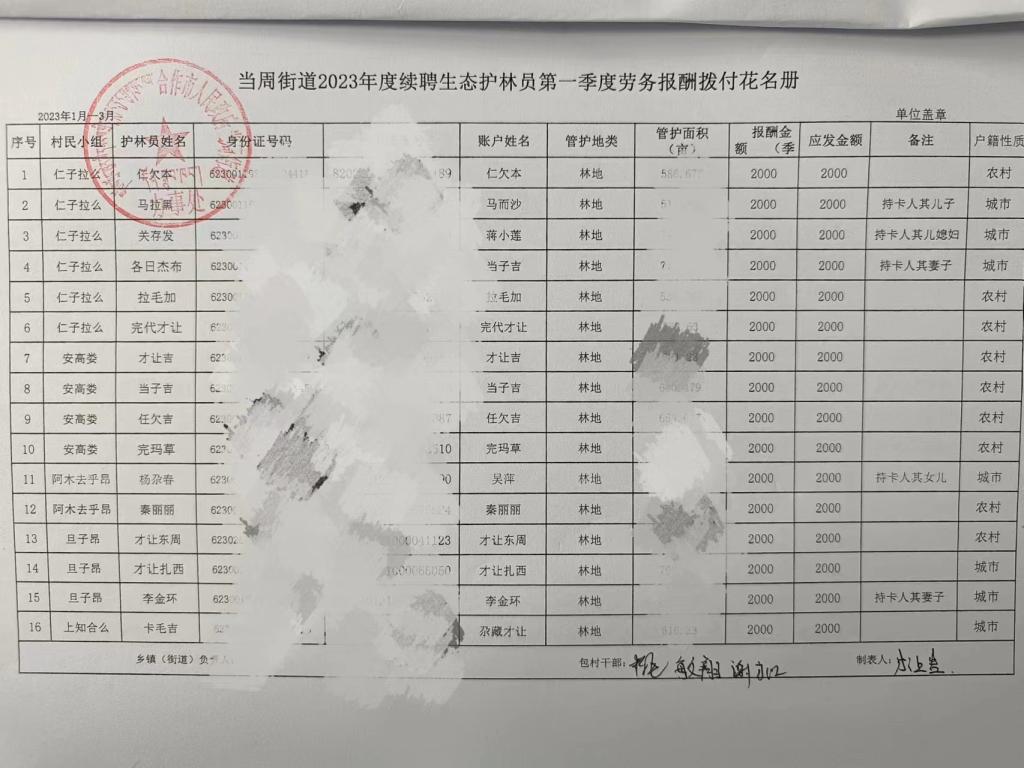 当周街道南木娄村2023年续聘生态护林员第一季度劳务报酬拨付花名册