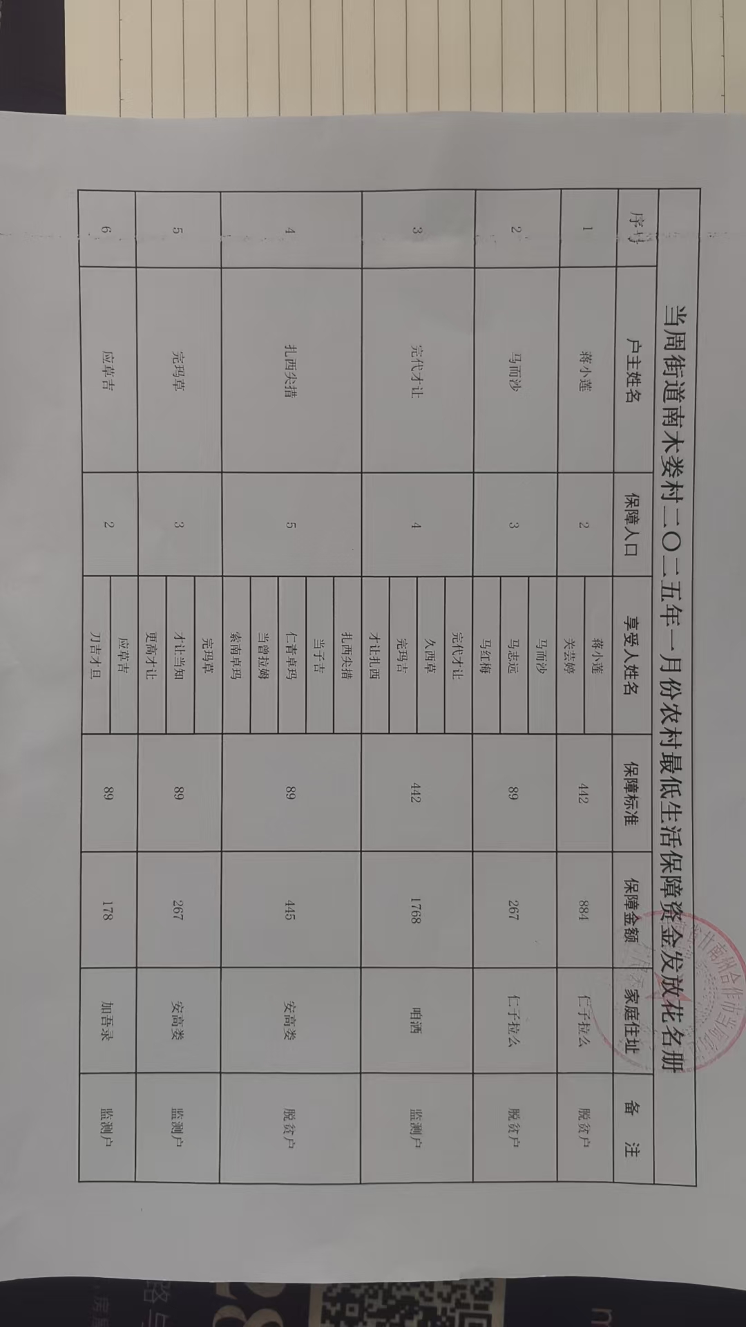 当周街道南木娄村2025年1月份农村最低生活保障资金发放花名册