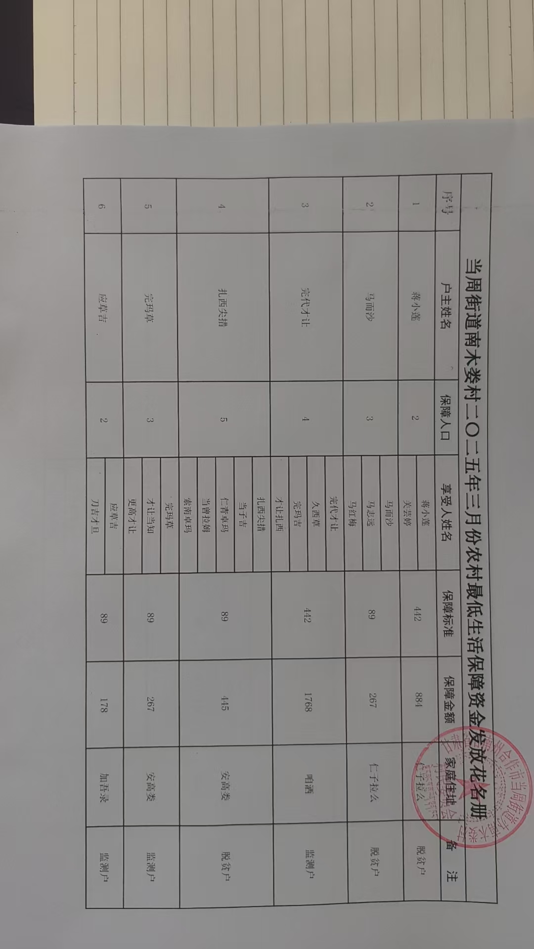 当周街道南木娄村2025年3月份农村最低生活保障资金发放花名册