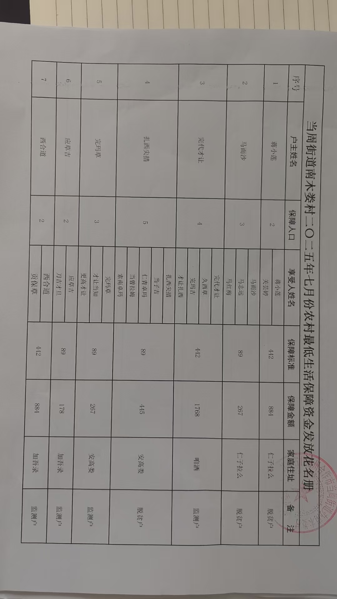 当周街道南木娄村2025年7月份农村最低生活保障资金发放花名册
