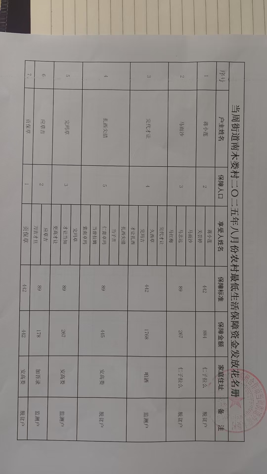 当周街道南木娄村2025年8月份农村最低生活保障资金发放花名册