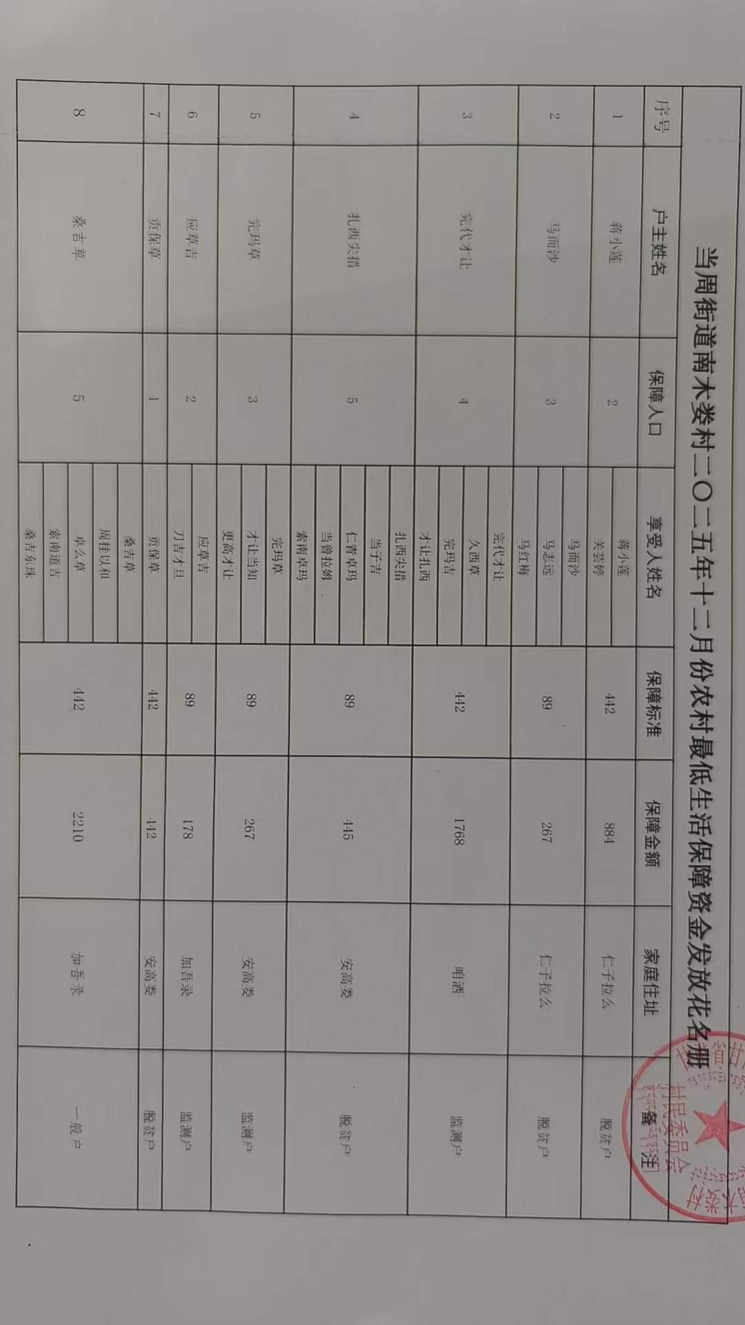当周街道南木娄村2025年12月份农村最低生活保障资金发放花名册