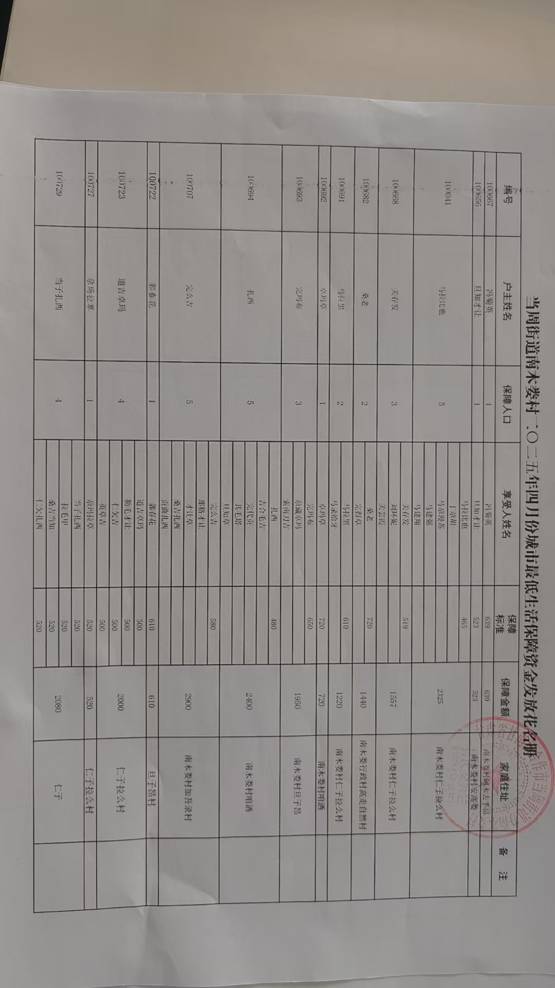 当周街道南木娄村2025年4月份城市最低生活保障资金发放花名册