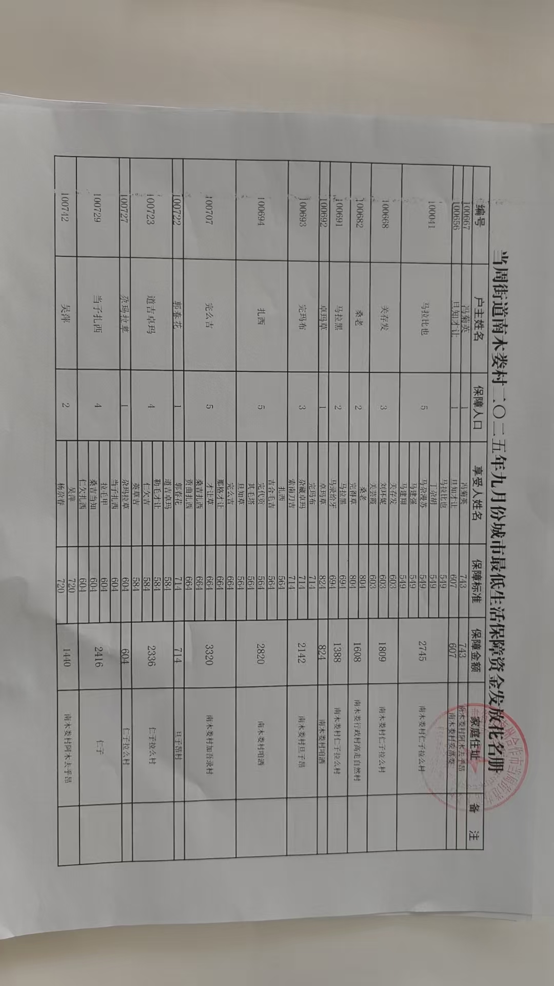 当周街道南木娄村2025年9月份城市最低生活保障资金发放花名册