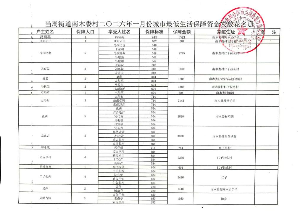 当周街道南木娄村2026年1月份城市最低生活保障资金发放花名册