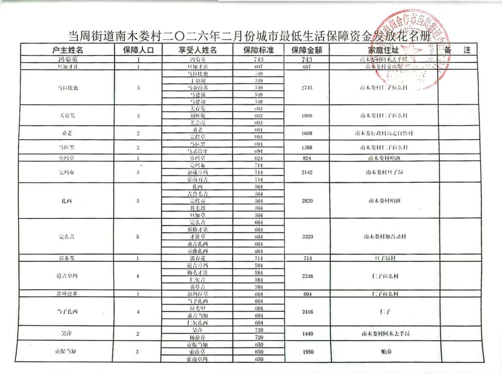 当周街道南木娄村2026年2月份城市最低生活保障资金发放花名册