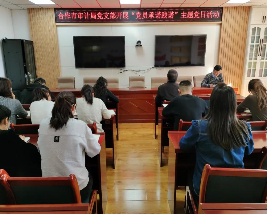 为进一步深入推进主题教育走深走实,紧紧围绕“学思想、强党性、重实践、建新功”的目标要求,引导支部党员立足岗位履职尽责,激发党员队伍活力,充分发挥党员模范带头作用,11月7日,合作市审计局党支部组织全体党员干部开展“党员承诺践诺”主题党日活动。活动由党支部副书记主持,支部全体党员干部参加。