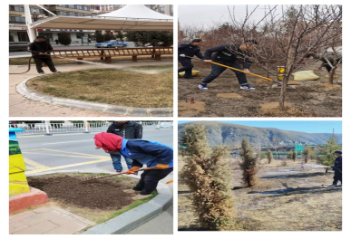 三、城区绿化养护工作。对已坏死、存在病害和缺肥的树木、草本类、花灌木等绿植,进行更换、喷洒农药、浇灌、施肥、修剪等工作;对城区裸露的地面进行统计和现场确定,按照技术规范进行补种;完成香巴拉文化广场和高速公路南、北口绿植雕塑设计工作。