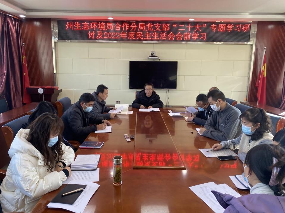 1月10日上午,甘南州生态环境局合作分局召开“二十大”专题学习研讨及2022年度民主生活会会前学习,全体干部参加了会议。会议传达学习了州委十三届三次全会暨州委经济工作会议精神,省生态环境厅党组书记苏君、厅长葛建团署名文章《为建设人与自然和谐共生的美丽甘肃而不懈奋斗》。书面学习了习近平总书记在中国共产党第二十次全国代表大会闭幕式上的重要讲话精神,李克强同志在参加党的二十大甘肃省代表团讨论时的重要讲话精神,中央列出违反八项规定清单80条,州市“两会”精神,《中华人民共和国黄河保护法》等。班子成员结合工作实际,对学习贯彻二十大精神开展交流研讨。