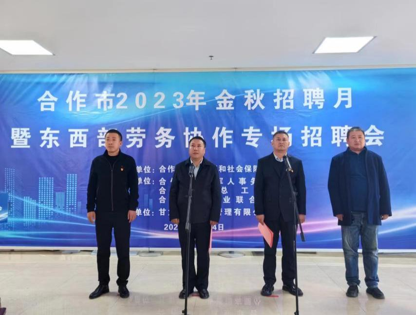 11月14日,市人社局、市退役军人事务局、市总工会、市工商业联合会联合举办合作市2023年金秋招聘月暨东西部劳务协作专场招聘会。市政府副市长杨海林,市委组织部副部长、市人社局党组书记、局长才让道布旦,市退役军人事务局何塔老,市总工会杨继荣等同志参加了活动。活动由才让道布旦同志主持。