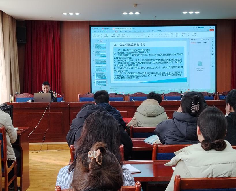 会上,市人社局相关工作人员以PPT的形式分模块认真详细讲解了《工伤保险法》《劳动合同法》《劳动保障监察条例》《企业劳动保障守法诚信等级评价办法》等劳动法律法规,以及讲解了一次性创业补贴和创业担保贷款相关政策。