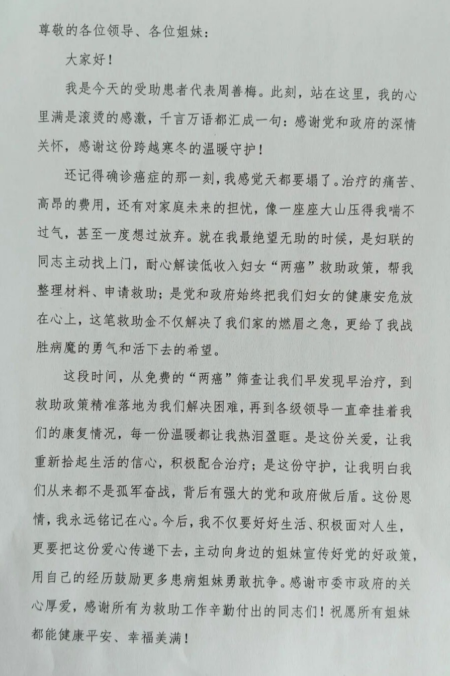 受助困境妇女、单亲妈妈周女士发表感言时哽咽着说“当得知确诊癌症的那一刻,感觉天都要塌了。治疗的痛苦、高昂的费用,还有对家庭未来的担忧,像一座大山压得喘不过气来,甚至一度想过放弃。就在最绝望无助的时候,是妇联的同志主动找上门,耐心解读低收入妇女‘两癌’救助政策,帮着整理材料、申请救助。是党和政府始终把困境妇女的健康安危放在心上,每一份温暖都让我热泪盈眶。是这份关爱,让我重拾生活信心,积极配合治疗。是这份守护,这份恩情,更给了我战胜病魔的勇气和活下去的希望,让我永远铭记在心。”
