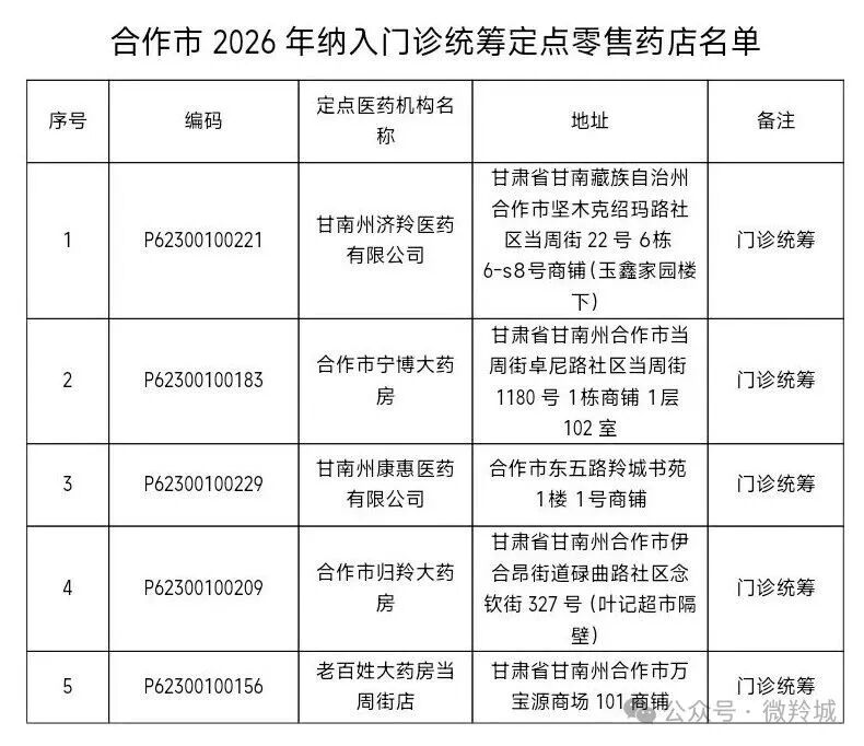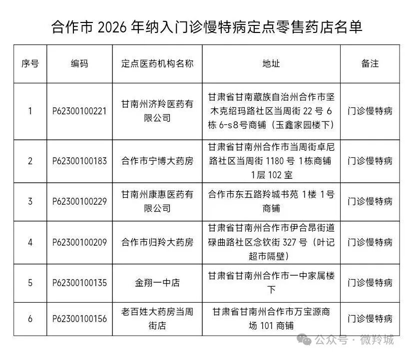 根据《关于开展2024年度甘南州门诊慢特病、职工门诊统筹定点药店申报工作的通知》及《甘南州基本医疗保障定点医药机构准入退出业务经办规程(试行)》(州医保字〔2025〕50号)要求,经甘南州医疗保障局评估小组评估、复核,现将合作市纳入名单予以公布。