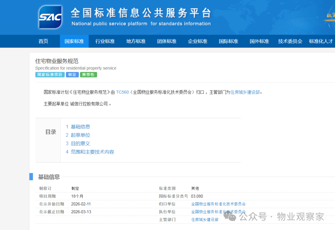 近日,全国标准信息公共服务平台公示了住宅物业服务规范的国家标准计划,平台显示住宅物业服务规范制定周期为18个月,也就是一年半的时间。起草单位为诚信行控股有限公司。