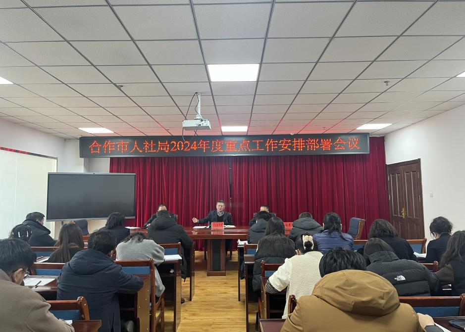2月27日,合作市人社局组织召开了2024年度重点工作安排部署会议,会议由市委组织部副部长、市人社局党组书记、局长才让道布旦同志主持,局科级以上领导干部及干部职工40余人参加了会议。会议传达学习了《全国人力资源和社会保障工作会议精神传达提纲》《全省人力资源和社会保障工作会议精神传达提纲》《全州人力资源和社会保障工作会议精神传达提纲》和《汪磊翔同志在全州人力资源和社会保障工作会议上的讲话》等会议精神。会上,市人社局两位副局长对分管领域工作了详细的安排部署,局主要负责人对合作市人力资源和社会保障局2024年度重点工作进行安排部署。