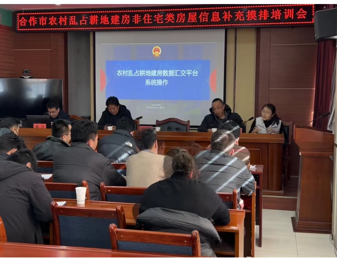 为贯彻落实党中央、国务院决策部署,坚决遏制农村乱占耕地建房行为,加快我市农村乱占耕地非住宅类房屋信息补充摸排信息采集的录入。2023年2月14日下午,合作市自然资源局组织召开合作市农村乱占耕地建房非住宅类房屋信息补充摸排培训和专题工作培训会。会议由市自然资源局党组成员、副局长旦正道吉主持、各乡镇分管领导及系统填报员、市农业农村局负责人、市自然资源局执法大队队长及各联络员参加会议。