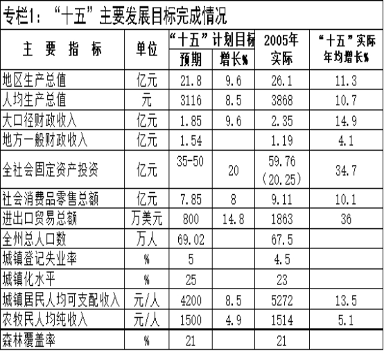 备注:2005年生产总值已采用全州经济普查数。全社会固定资产投资为五年累计完成数,括号内为2005年实际完成数。 “十五”期间,虽然我州经济社会发展取得了令人瞩目的成就,但我们必须清醒地认识到,未来五年,我州仍将处在夯实发展基础,消除“瓶颈”制约,加快发展的历史阶段。自然条件差,经济综合实力弱,自我发展能力不强,发展水平和发展阶段滞后于全省,仍是我州的基本州情。“十一五”时期,我州加快发展面临着一些突出问题和困难;交通、能源、市政等基础设施 “瓶颈”制约仍未打破;农牧业生产基础条件脆弱,农牧民增收困难,农牧业综合生产效率低,扶贫任务重;工业化水平低,工业增长过分依赖黄金等不可再生资源的开发和耗能工业的发展;民营经济发展还不活跃,实力不强,对外开放总体水平较低;财源结构单一,“吃饭”与“建设”的矛盾突出,城乡居民收入渠道不多,就业和再就业压力较大;经济社会协调发展任务重,发展经济和保护生态的双重压力进一步加大;处于改革攻坚和利益调整时期的各类社会矛盾增多,协调好各方面利益关系的难度加大,构建和谐社会、实现各民族团结和睦与共同繁荣进步的任务相当繁重。研究和解决以上这些困难和问题,既是我们长期面临的艰巨任务,又是“十一五”期间全州经济社会发展的迫切需要,我们要全面落实科学发展观,用加快发展的办法来作为解决困难和问题的惟一途径,积极主动迎接挑战,开拓创新,扎实工作,推进全面建设小康社会进程。 专栏2:发展基础与发展阶段 1、经济综合实力弱,自我发展能力不强。2004年,全州经济总量仅占全省的1.4%,在全省排在最末位,在全国三十个少数民族自治州中排在第23位;人均国内生产总值仅相当于全省平均水平的54.5%;大口径财政收入仅占全省财政收入的0.95%;大多数主要综合经济指标一直排在全省十四个市、州的末位。 2、实现全面建设小康社会“第二步”目标阶段。按照人民生活水平达到小康水平的16项指标,2004年我州总体小康目标实现程度仅为52%左右,比全省低33个百分点,按照我州全面建设小康社会规划实施纲要,2010年,全州实现全面建设小康社会第二步目标,2015年前实现总体小康,落后全省近10年。 3、加快工业强州战略,推进工业化阶段。我州工业化水平低,正处在工业化前期阶段,2005年,我州第二产业增加值占生产总值比重为20.7%,比全省低27.9个百分点,第一产业比重占生产总值比重为31.7%,比全省高出13.6个百分点,城镇化率为23%,低于全省5.6个百分点,工业化前期特征明显。 4、提高人民生活水平,缩小城乡差距攻坚阶段。2005年,全州城镇居民人均可支配收入为5272元,比全省平均水平低2768元,农牧村居民家庭人均纯收入为1514元,比全省平均水平低449元,城乡收入差距扩大为3.5:1。 5、推进非公有制经济加速发展阶段。我州非公有制经济发展缓慢,2005年,我州非公有制经济增加值达到7.2亿元,占全州生产总值的27.8%,低于全省平均水平。 二、发展环境 “十一五”时期,国家坚持以科学发展观统领经济社会发展全局,构建和谐社会,继续实施西部大开发战略,加大对西部地区的投入,特别是加大对少数民族地区的支持力度,有利于我州在基础设施建设、生态环境建设、发展特色经济和推动社会事业进步等方面争取到国家和省上更多的政策、资金支持;国家提出建设社会主义新农村,逐步加大对农牧村基础设施和公共服务事业的投资,有利于我州转换二元经济结构,解决好“三农(牧)”问题,加快农牧村各项建设事业的发展,提高城乡居民收入和生活水平;未来几年我州在建的一大批电站投产运营,将有效促进水电工业、旅游业的快速发展,这不仅对加快全州工业化进程,繁荣第三产业十分有利,而且对劳动力尤其是技术工人的需求量增大,为我们大力发展劳务经济,提高就业和再就业率,积极发展职业教育,拓宽城乡居民的增收渠道,带来了非常好的机遇。经济全球化和新科技革命的迅猛发展,产业转移和结构调整步伐加快,有利于我们充分利用两个市场、两种资源,扩大对外开放,发展外向型经济。州委“1422253”发展战略与国家出台的一系列扶持民族地区加快发展的新政策、新举措及产业发展方向相对接吻合,全州上下加快发展的合力已基本形成,对我们进一步加大发展抓项目工作力度,调整经济结构,做大做强优势特色产业,加快发展步伐提供了良好机遇。随着人们对精神文化需求的日趋旺盛,文化交流日益频繁,加上我州旅游业的蓬勃兴起,有利于我们立足深厚的民族文化底蕴,积极整合民族、宗教、民俗、民间文化资源,大力发展文化产业;总体来看,“十一五”我州面临着有利因素大于不利影响,机遇大于挑战的发展环境。面对新形势和新的任务,我们必须以科学发展观为指导,紧紧抓住战略机遇期,把加快发展作为第一要务,按照“五个统筹”的要求,坚定不移地实施州委“1422253”发展战略,坚持“发展抓项目,改革抓企业”的工作思路,促进经济社会全面协调可持续发展,促进全州物质、精神、政治文明共同进步。 第二章 经济社会发展总体思路和主要目标 一、指导思想 “十一五”全州经济社会发展的指导思想是:认真贯彻党的十六届五中全会精神,按照州委九届十一次全委会确定的“坚持以科学发展观统领经济社会发展全局,坚持州委确定的“1422253”发展战略,坚持把各民族‘